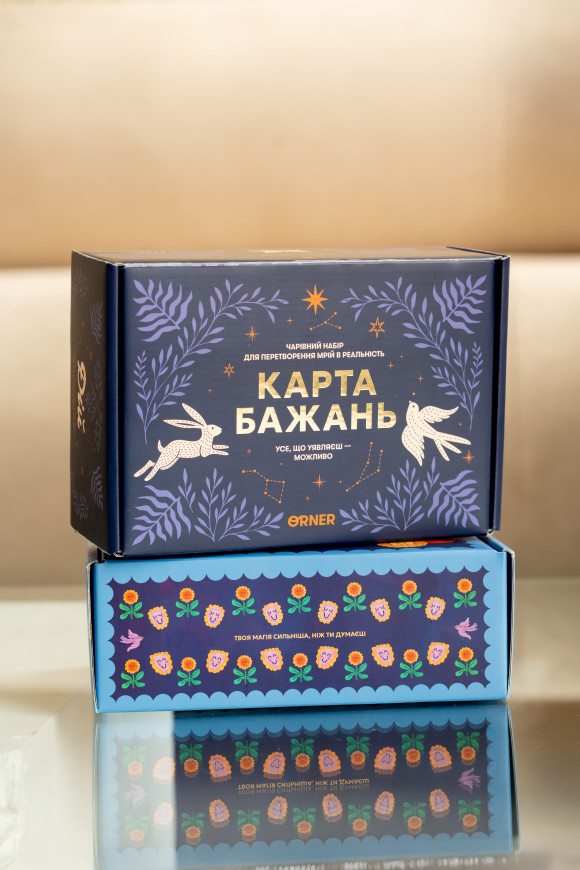 Inside is a large A1 board for visualizing dreams and goals, 30 cards for self-reflection, a diary for working with them, and a set of stickers.