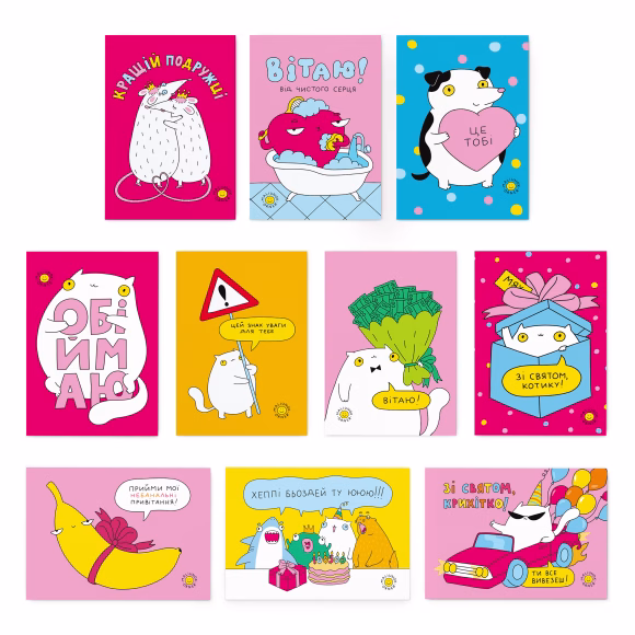 Внутри — 10 ярких и весёлых открыток, которые подойдут для разных людей и разных событий.