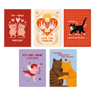 Внутри набора — 5 открыток, каждая из которых о своем: о ваших любовных чувствах или о том, как вам прикольно вместе и как прекрасно иметь такого человека рядом.