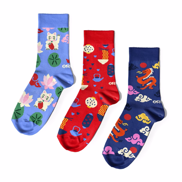 Азиатская эстетика не обошла этот набор носков, так что теперь вам остается только выбрать, какая пара станет вашим личным талисманом: с Манеки-неко, лапшой или драконом?