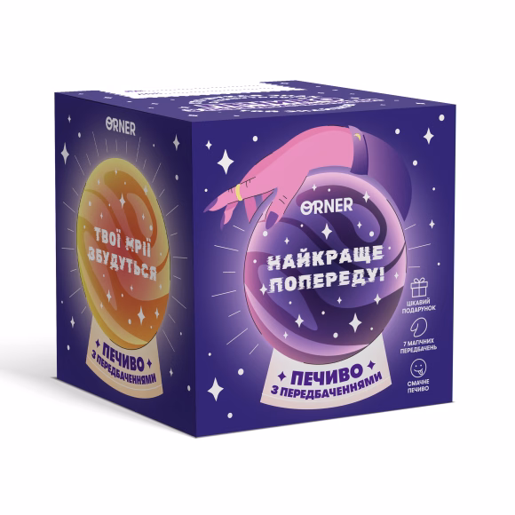 Внутри — 7 штучек печенья, которое выглядит как в фильмах, вкусное, как в мечтах, и дарит предсказания, в которые хочется верить. И, конечно, прикольно хрустит и ломается