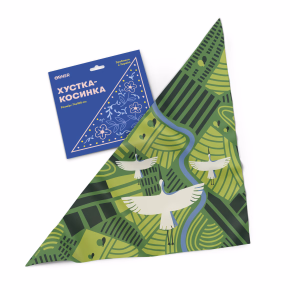 Хустка-косинка «Українські поля» — це справжній ковток свіжого повітря. Ілюстраторка Ліна Кобрін зобразила знайомі простори такими, якими їх бачать крилаті мандрівники — у вигляді геометричних клаптиків родючого чорнозему та синьої річечки. Цей дизайн вкотре нагадує, яка ж масштабна та прекрасна наша Україна.