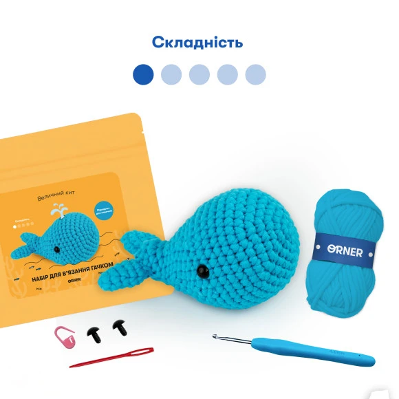 Для зручності в кожному наборі є все необхідне: пряжа, гачок, маркер для позначення рядів, пластикова голка, наповнювач та очі з безпечним кріпленням.