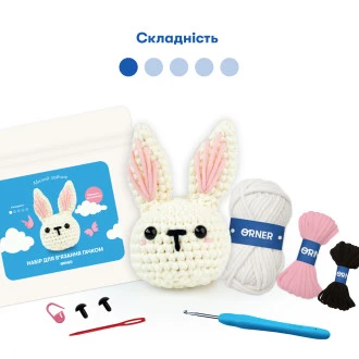 Для зручності в кожному наборі є все необхідне: пряжа, гачок, маркер для позначення рядів, пластикова голка, наповнювач та очі з безпечним кріпленням.