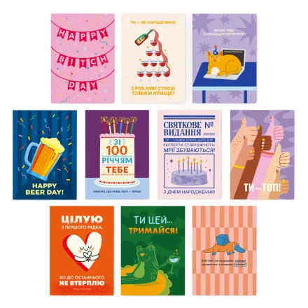 Ми підготували набори прикольних привітальних листівок, які хочеться дарувати просто так і з будь-якого приводу.